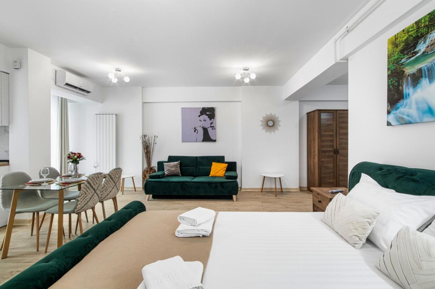 Featuring accommodation with a rooftop pool, sea view and a terrace, Green Dew - Infinity Pool & Spa Resort isin Mamaia Nord. This beachfront property offers access to a balcony. Offering free WiFi throughout the property, the non-smoking apartment features a sauna.