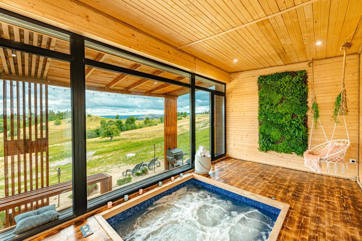 Three-Bedroom Villa. Guests will have a special experience as this villa offers a hot tub and a fireplace. Meals can be prepared in the kitchen, which has a refrigerator, kitchenware, an oven and a toaster. The villa features a tea and coffee maker, a barbecue, a terrace with mountain views as well as a shared bathroom boasting a shower. The unit has 3 beds.